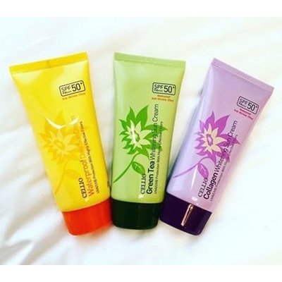 Kem chống nắng Cellio Waterproof với mẫu mã đa dạng, có 3 màu tương ứng với loại da và mục đích sử dụng khác nhau: