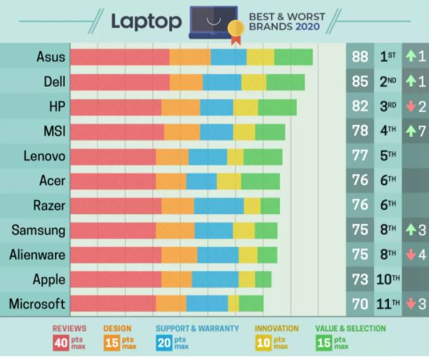 Mỗi thương hiệu đều có các đặc điểm riêng với mức giá khác nhau và chế độ bảo hành. Dưới đây là xếp hạng các dòng laptop được ưu thích 2019:
